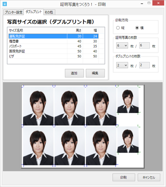 証明写真をつくろう!は自前の写真から、さまざまなサイズの証明写真用データを作成できます。運転免許証、履歴書、パスポート、国際免許証、ビザと、メジャーな証明写真の規格にはすべて対応しています。