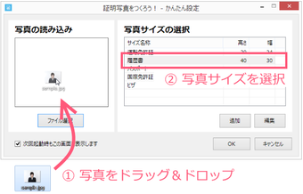 ソフトに写真を取り込んだら、欲しい証明写真の規格を選択。顔の中心点や脳天、アゴ先を指定すれば、自動的にぴったりのサイズにトリミングしてくれます。なお、おうちで証明写真 Gura Shotは30mm×30mmのような特殊規格にデフォルト機能で対応していますが、証明写真をつくろう!は自分でサイズ登録が必要です。