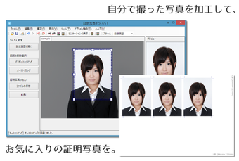 証明写真をつくろう!は、自分で撮った写真を使って証明写真用データを作成できる写真加工ソフトです。明るさ、コントラストなどの補正を行い、証明写真用のサイズへ簡単にトリミング。出力したデータをコンビニや写真屋でプリントアウトすれば、履歴書やパスポートに使える証明写真を手軽に用意できます。